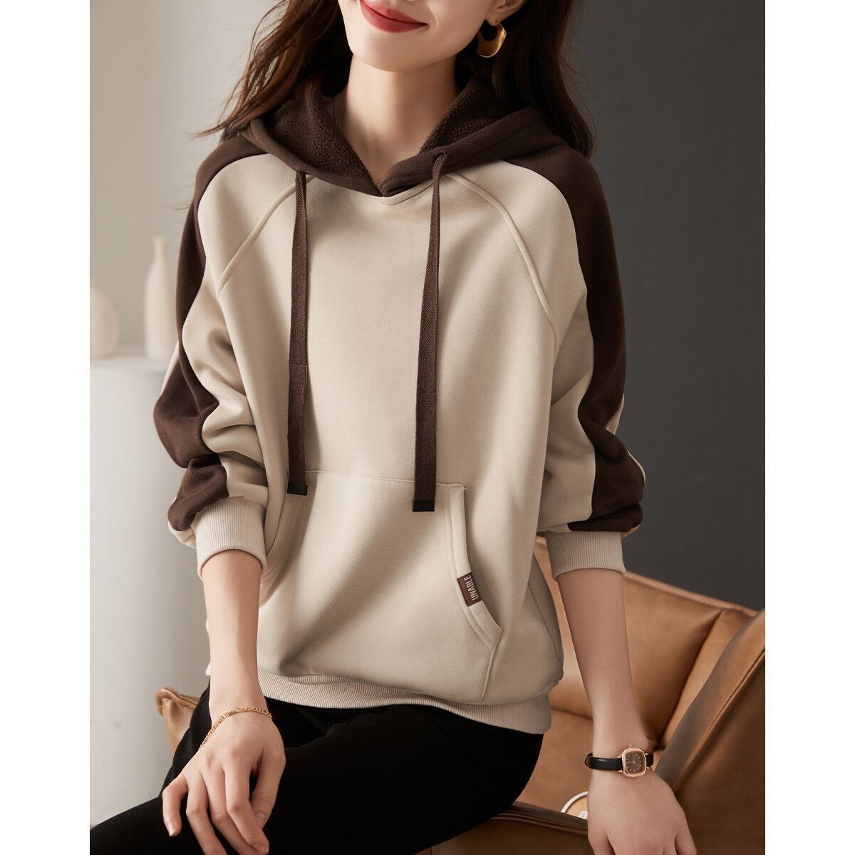 2024年冬新作 シンプルで万能なフード付きコントラストカラースプライシングルーズフィットスウェットシャツ レディースファッション