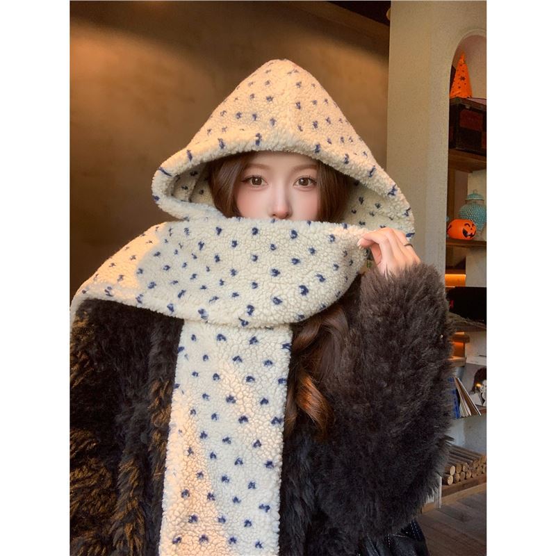 韩系氛围感帽子围巾一体女冬季加厚保暖毛绒护颈连帽围脖防风防寒