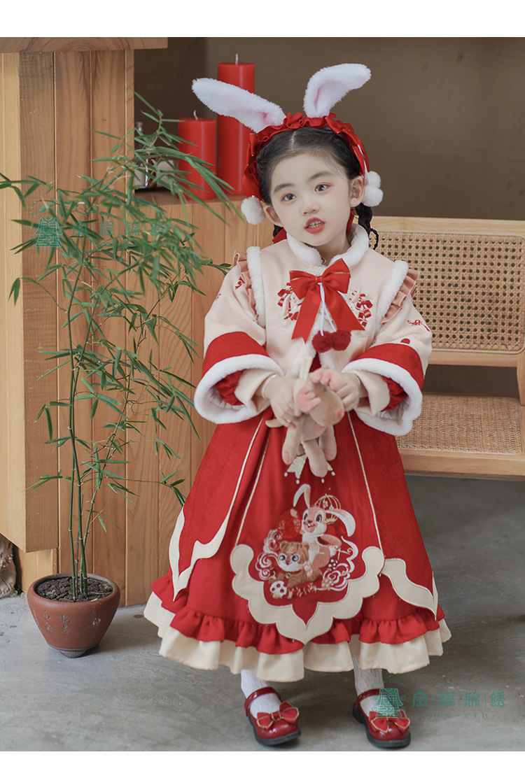 冬の新型の漢服の女の子の明製の馬のスカートのスーツの子供の新年の服の国風の毛の上着の新年の服装