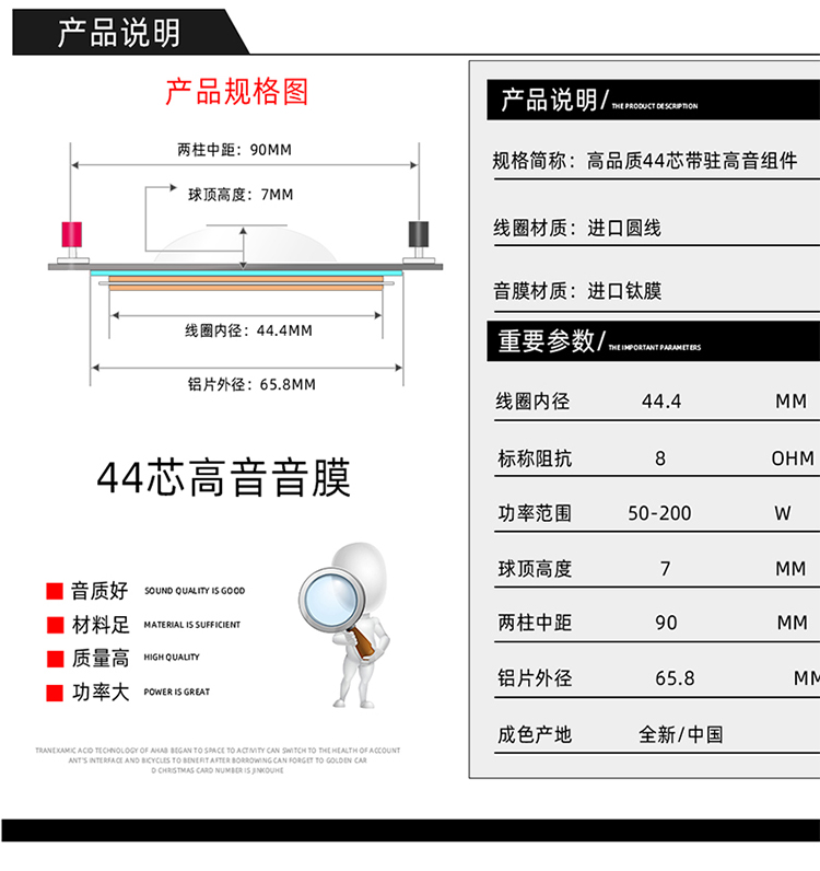 44.4mm ハイボーカルチタン振動板、円柱状ワイヤー44芯スピーカー、高音域ホーン、ハイボーカルドライバーヘッドスピーカー