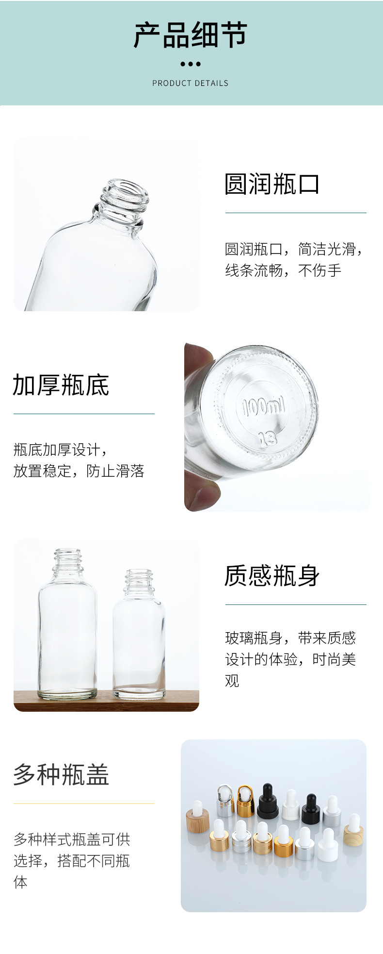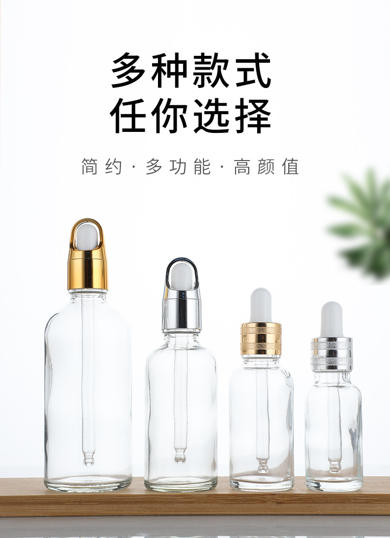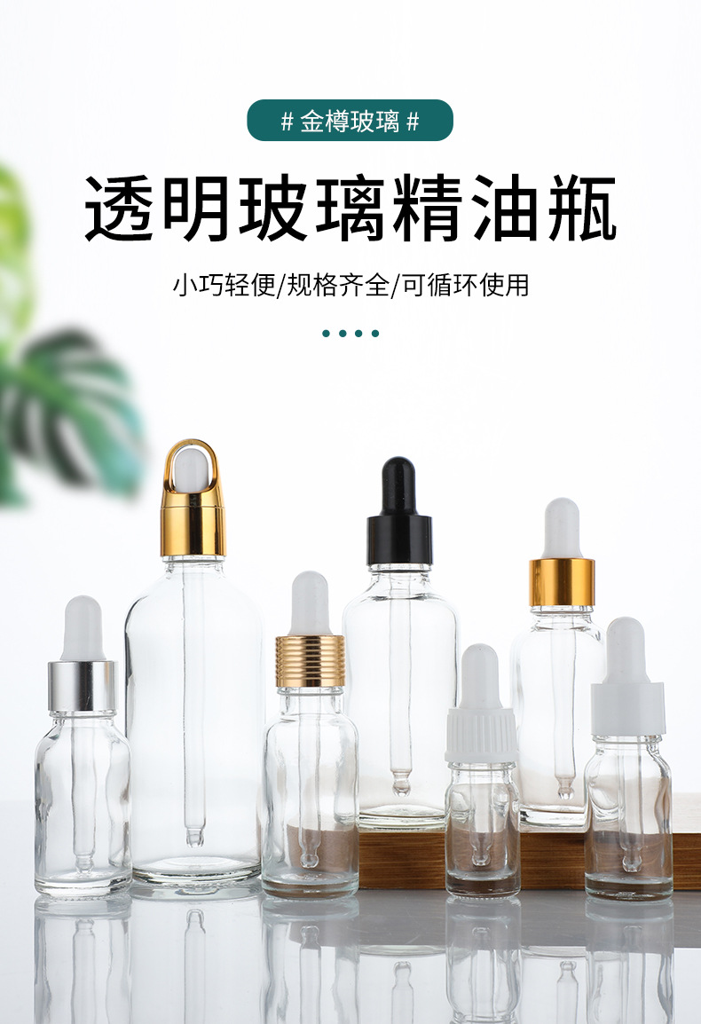 卸売りガラス透明滴管精油瓶ゴム頭精華液瓶カバー肩分注小サンプル瓶圧ポンプ押し空瓶