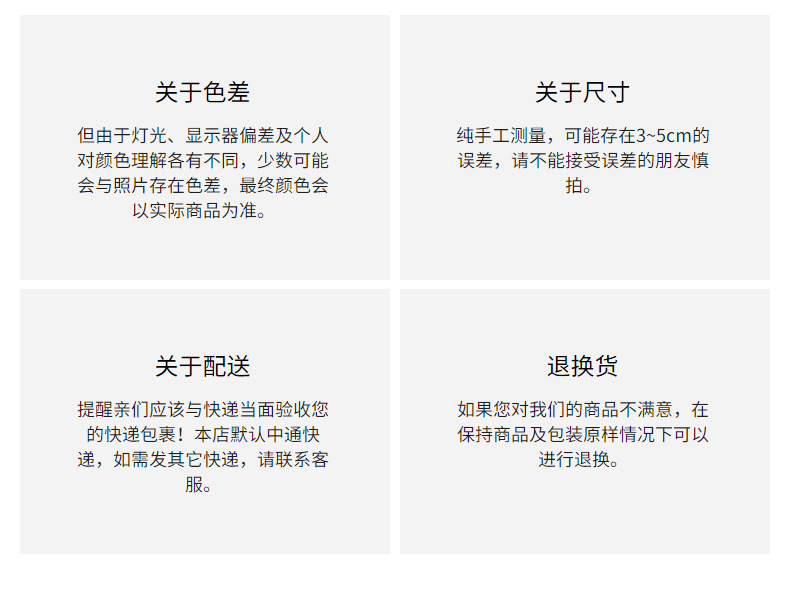 6.针织类产品会做固色处理,但不可避免偶尔会出现缩水、起球、褪色等现象,第一次洗请用盐水固色。另外,针织品有小线头和小结头不属于质量问题,要求苛刻的可能无法满足哦~