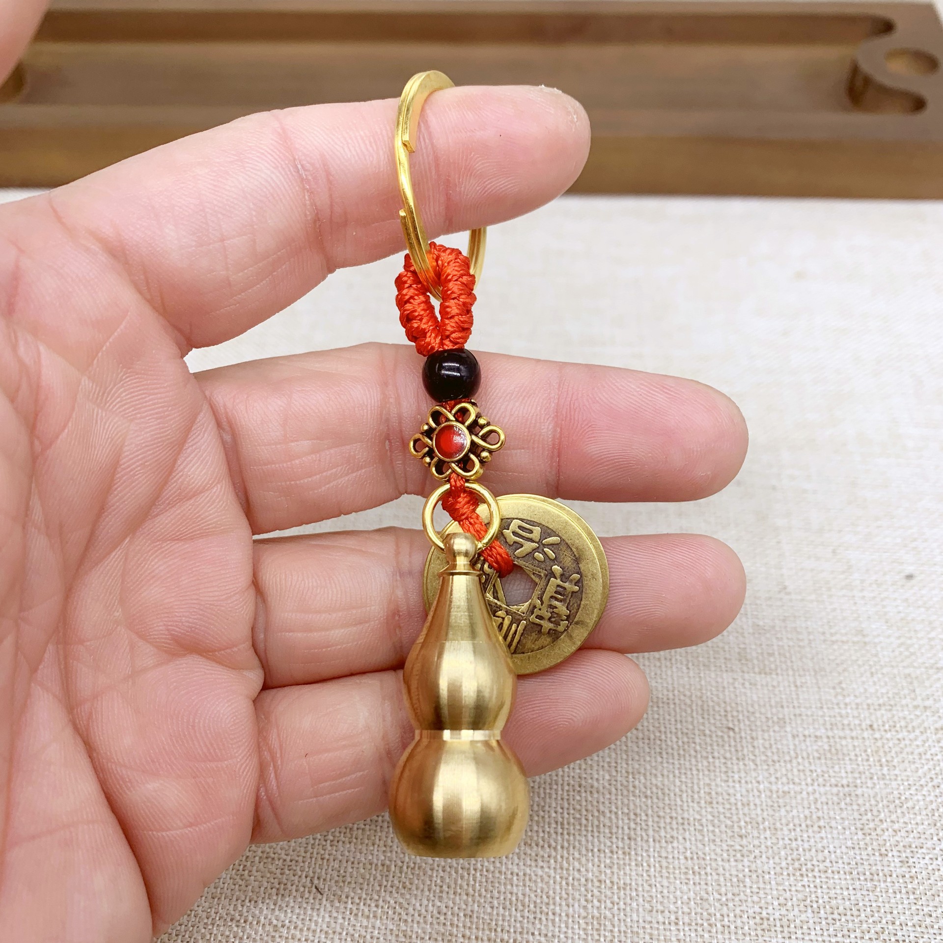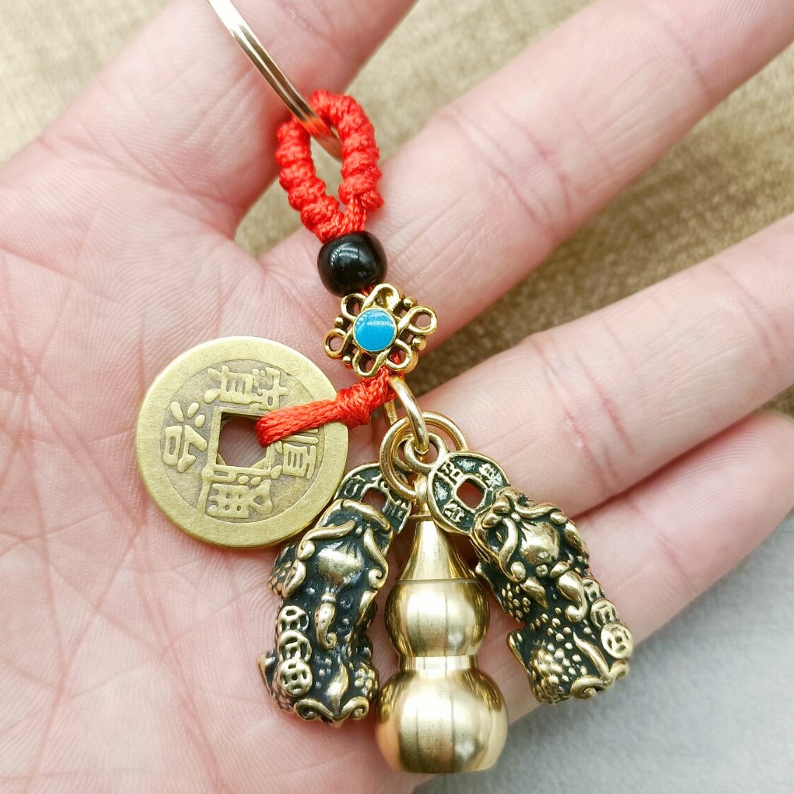 真鍮製五帝銭朱砂瓢箪キーホルダー、左右の金銭貔貅、玄関吊り下げ飾り、車の鍵、招財用。