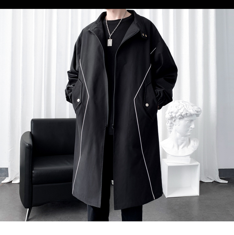 2023韓国版欧巴メンズ春秋風衣男長型衝突色線装飾コート男中長型コート爆景