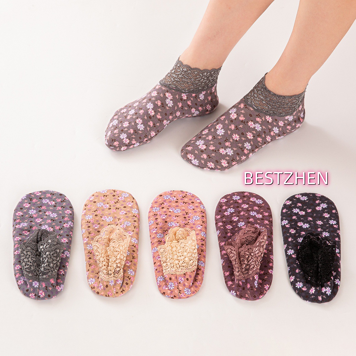 缤纷小碎花德绒袜子女地板袜蕾丝花边短筒保暖加绒抗寒秋冬季加厚