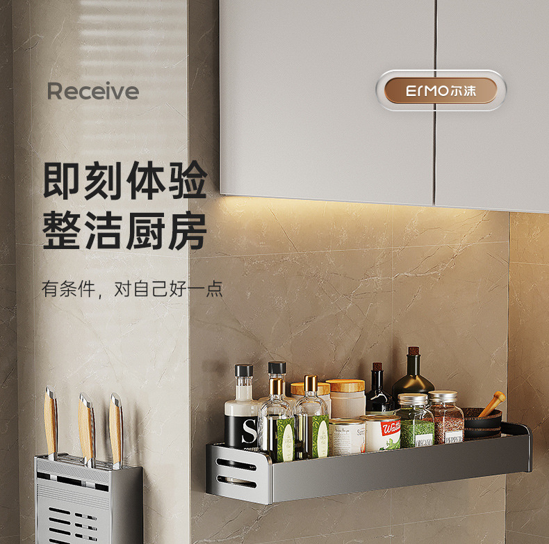 軽くて豪華な台所の物置棚の調味料棚の炭素鋼は穴を開けないで壁掛け式の調味料の家庭用品の壁の収納棚をかけます。