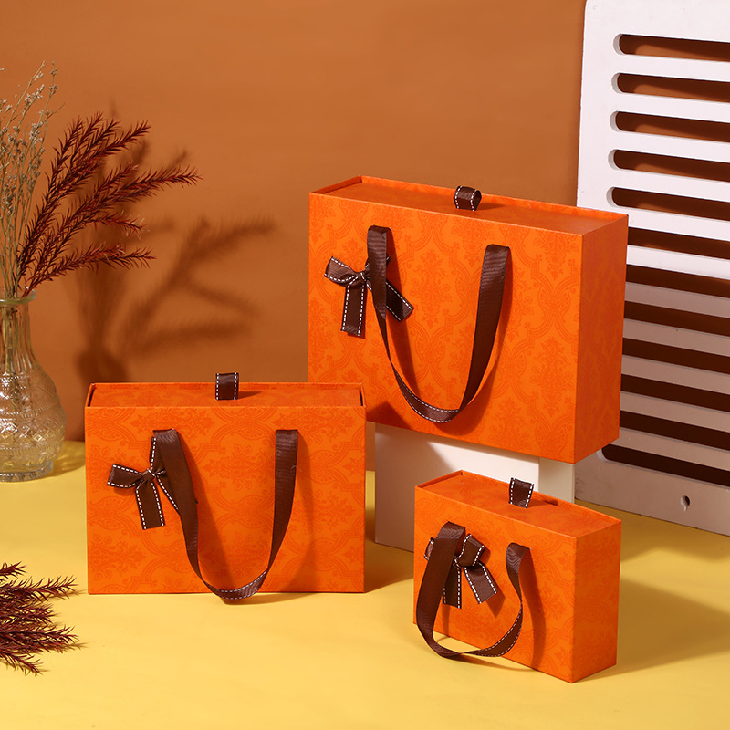 現物のレトロなオレンジ色の蝶結びの引き出し式の贈り物の箱の下着のスカーフの包装箱の空の箱のお土産の箱