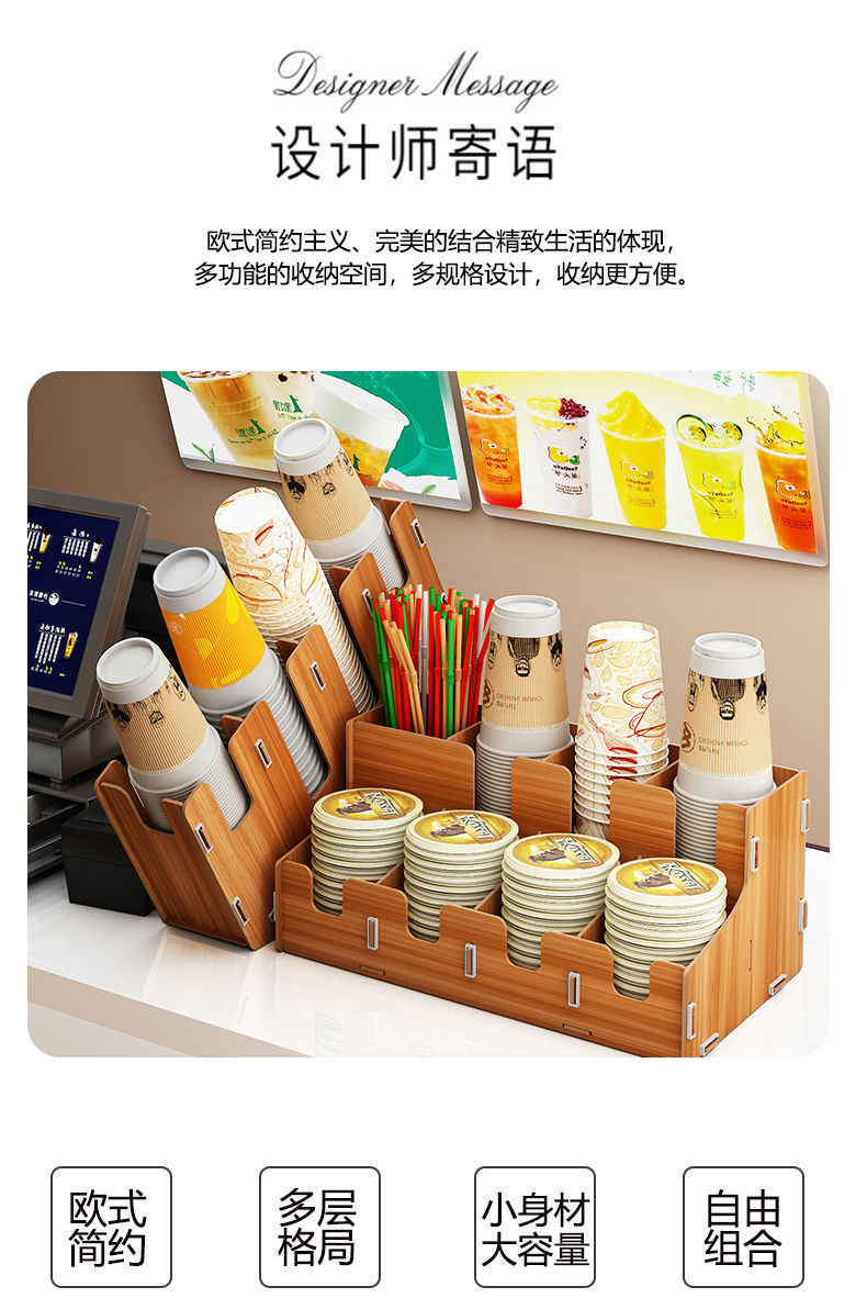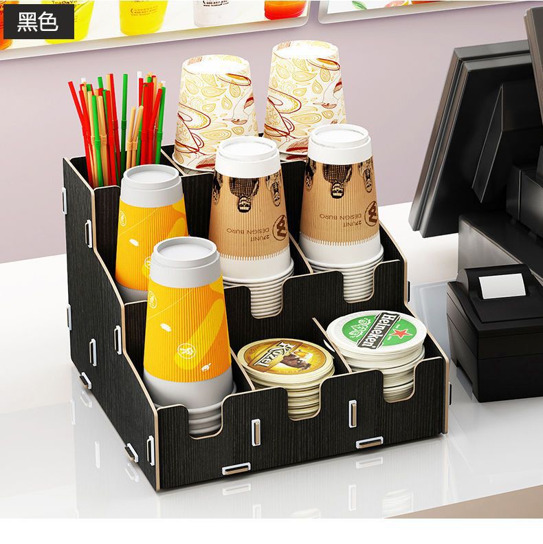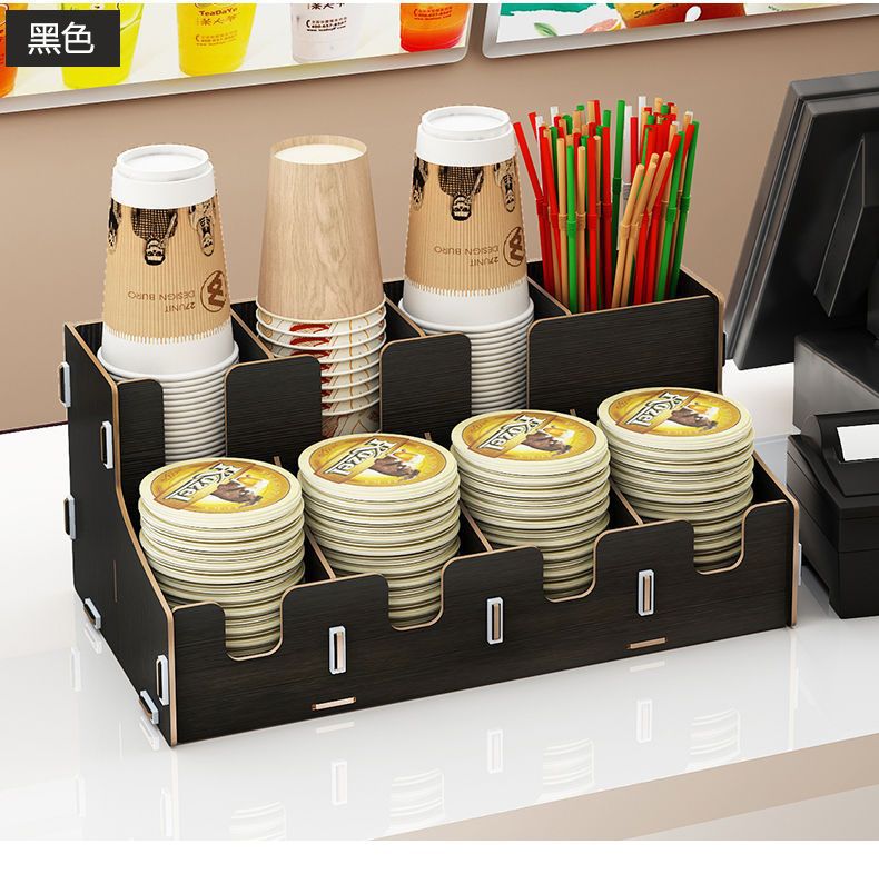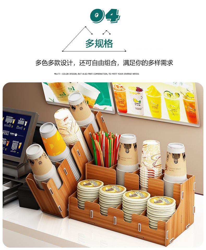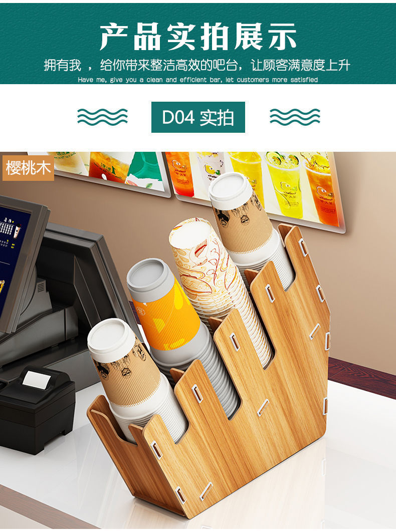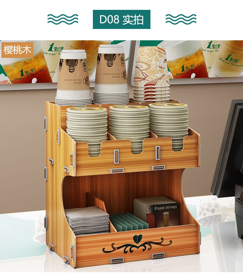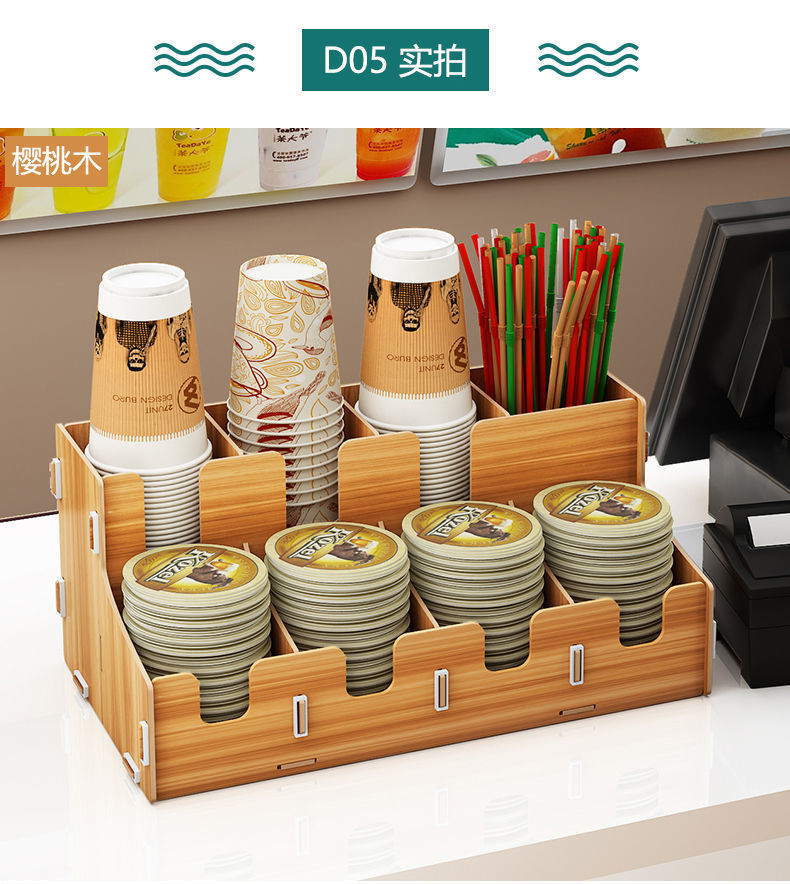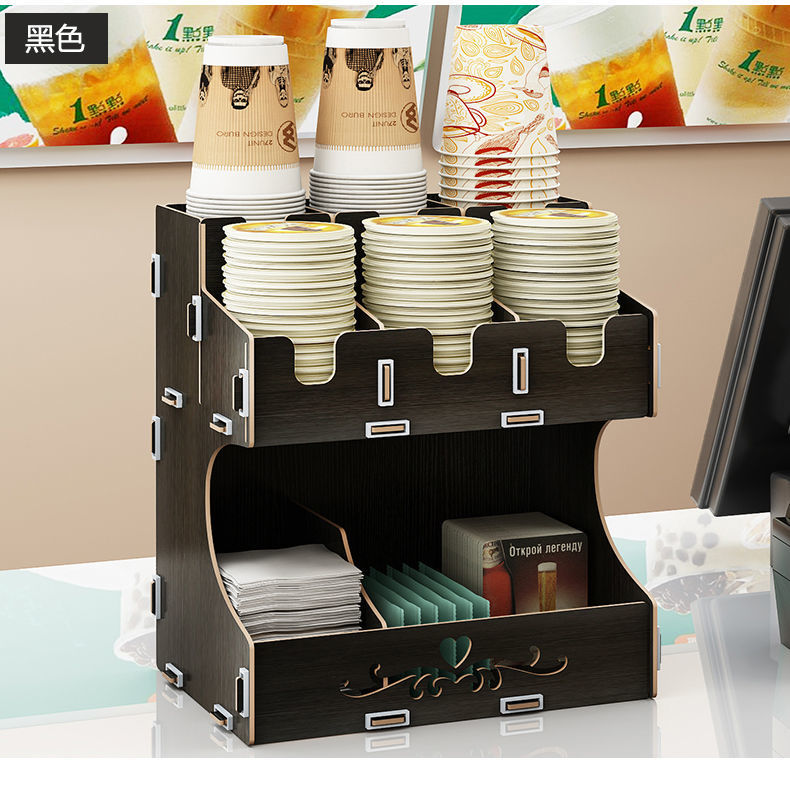 使い捨て紙コップ収納棚ミルクティー店はカップを取っています。