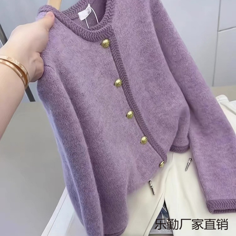 慵懒风漂亮软糯绒衫毛衣女高端超好看极简风木扣罗兰紫针织开衫