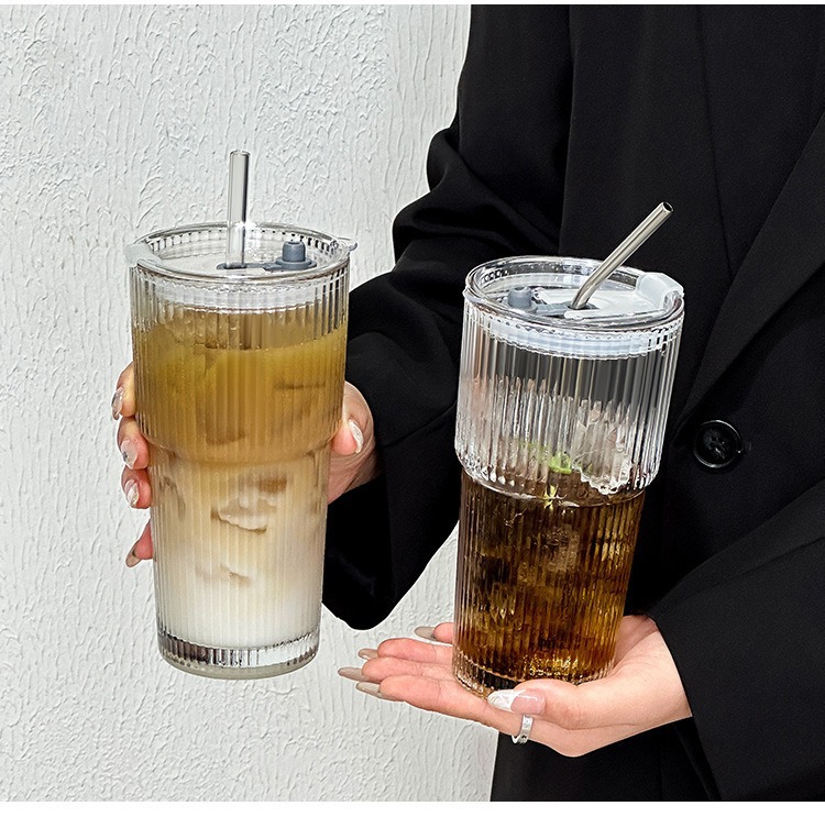 Ins風大容量高颜値冷飲杯ジュースコーヒーカップ蓋付きストロー付き縦縞グラスコップコップ