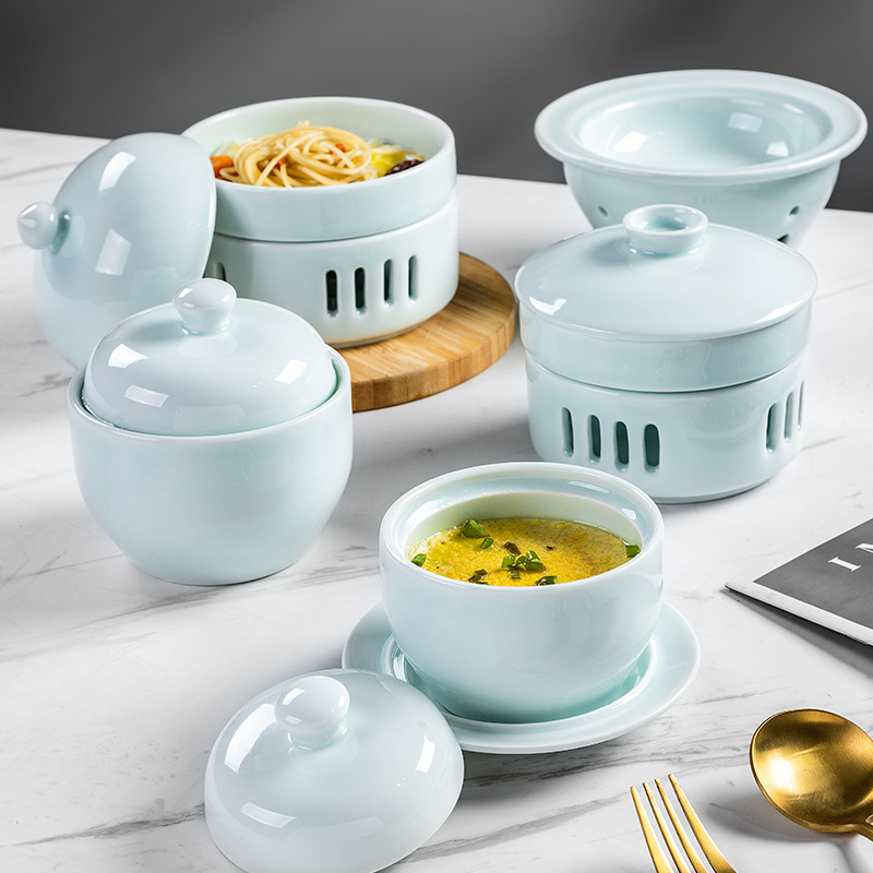 天青釉薬の上で杯のストーブのホテルの中のレストランの陶磁器のツバメの巣のフカヒレのアワビの1人の杯のストーブを煮込んでいます。