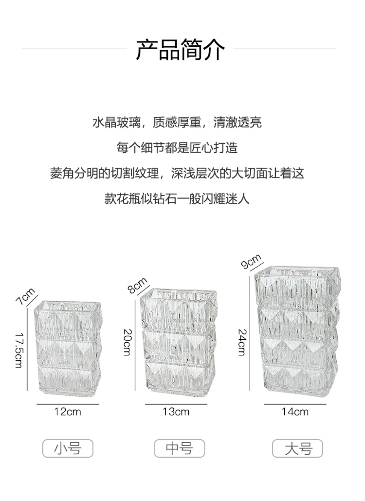 现代加厚水晶透明玻璃花瓶摆件客厅插花鲜花玫瑰百合花格纹花器瓶