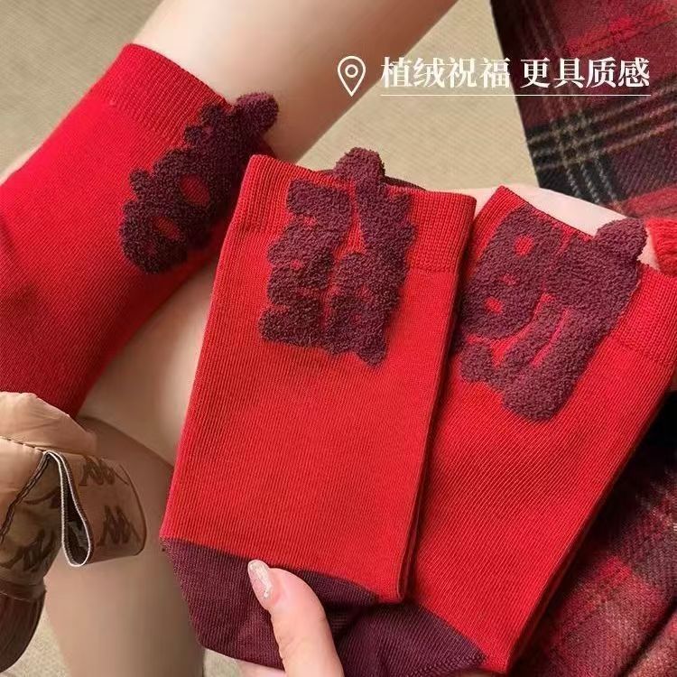 新年新款发财好运红袜本命年喜乐暴富袜子女秋冬AB面创意立体