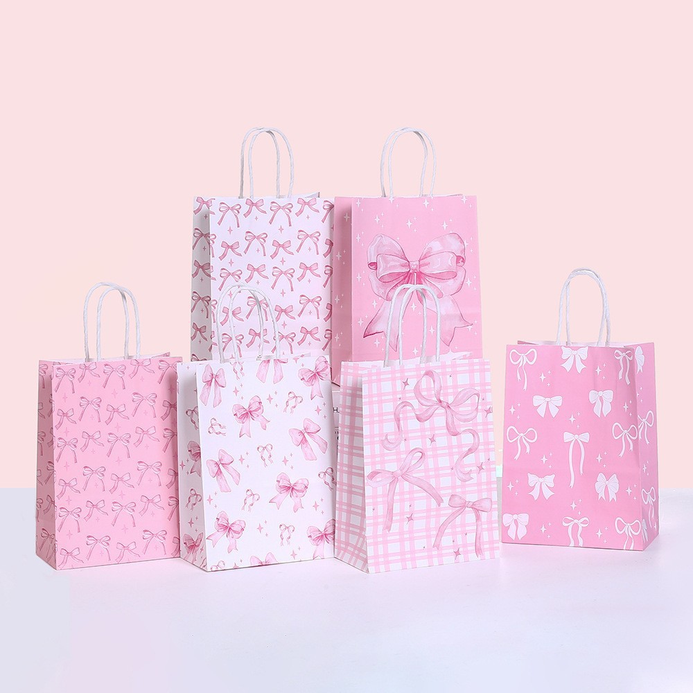 新商品の小さい清新な蝶結びのプリントの手提げ袋のパーティーのプレゼントの包装袋のショッピングの卸売りのクラフト紙