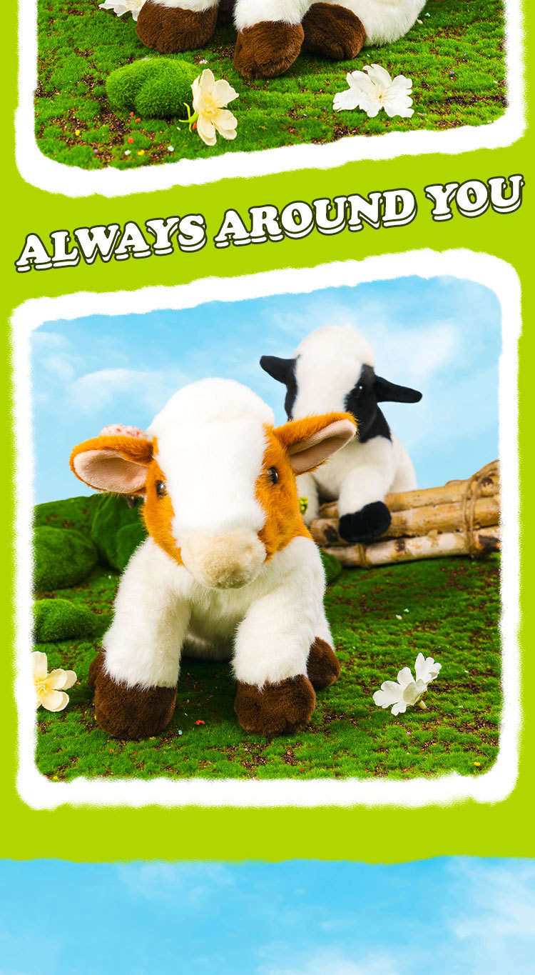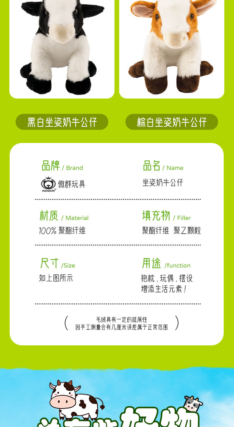 カラー 茶色と白の座っている牛の人形,白黒の座りポーズの牛のぬいぐるみ