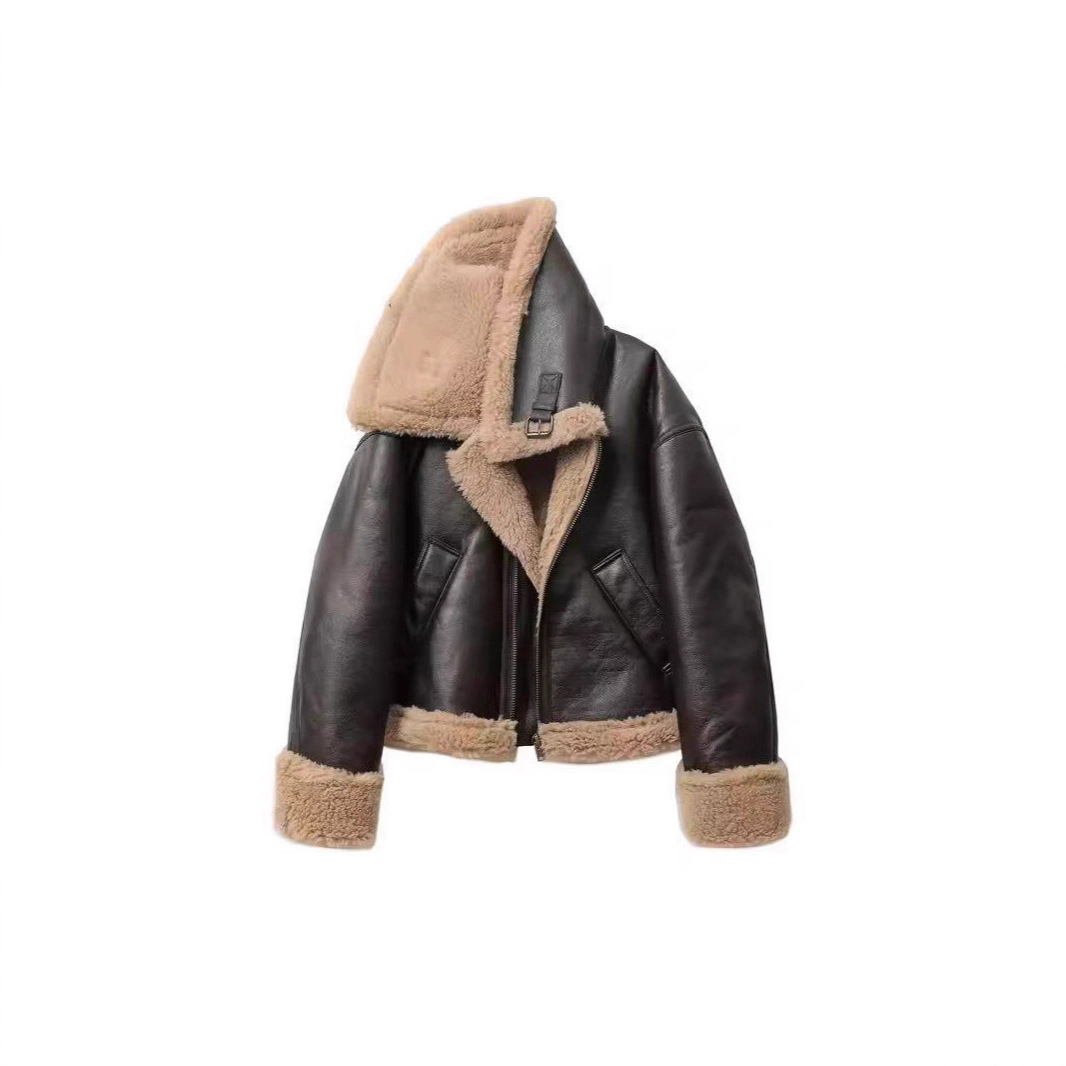 2025年冬季新款法式通勤风大翻领皮毛一体夹克PU皮衣外套保暖夹克
