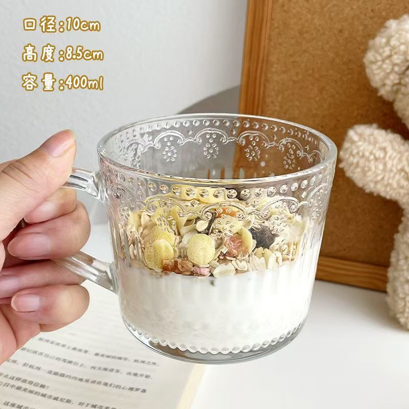 グラスミルクカップ取っ手付き高颜値コーヒーカップ家庭用レトロレリーフオート麦朝食カップinsラテ
