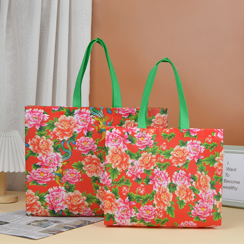 東北の大きい花の目立つ包装袋の赤いお祝いの贈り物の袋は厚い不織布の服装の手提げ袋のプリントの卸売りをします。