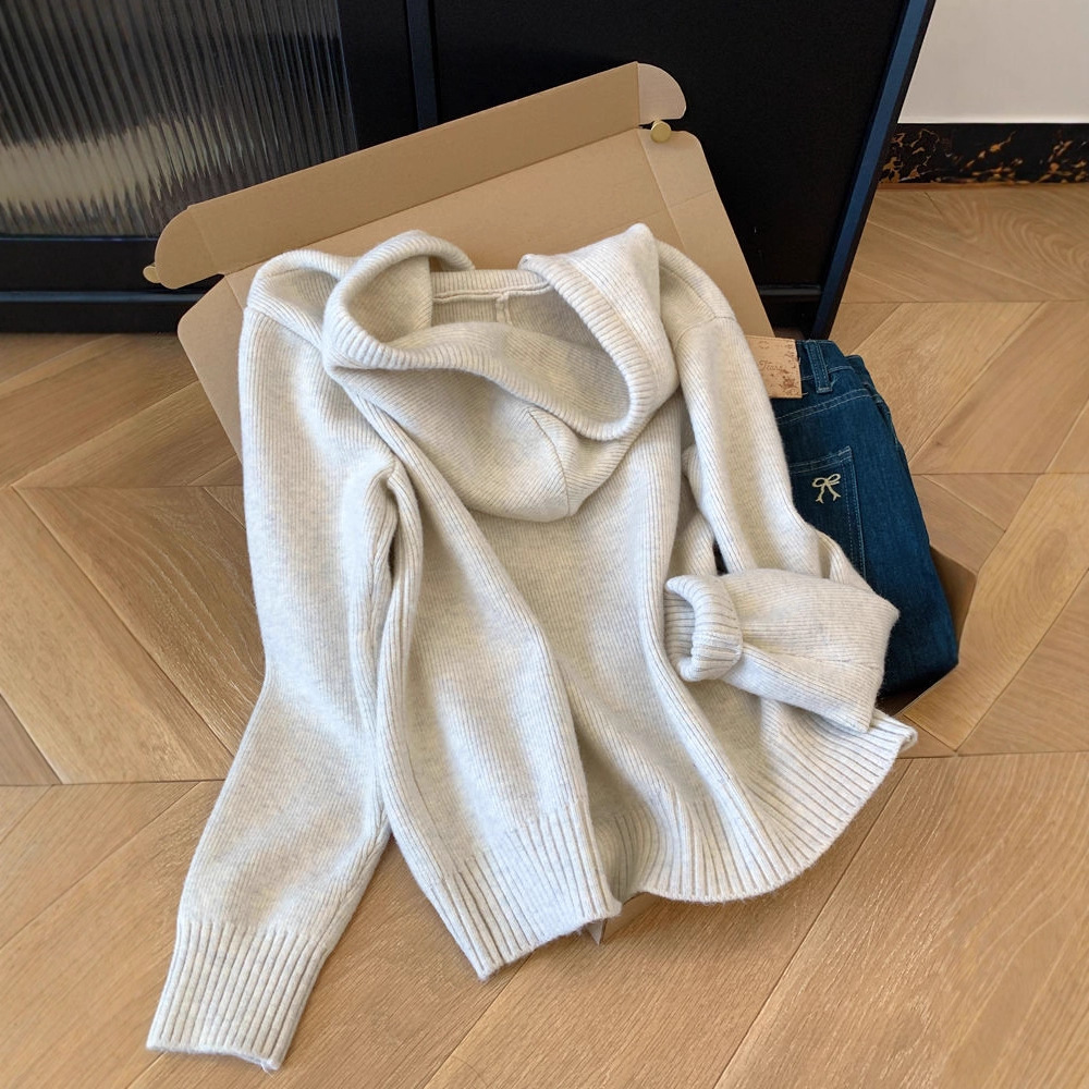 HUOTONG双拉链连帽长袖针织开衫毛衣外套女士慵懒风高级感上衣