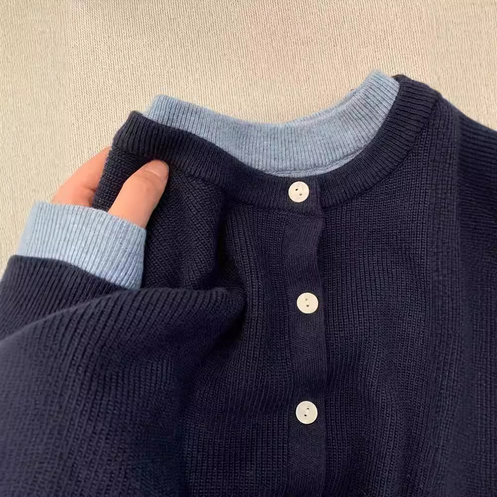 2025年新作の女性用高級ネイビーブルーセータージャケット、秋冬向け、ゆったりとしたゆったりとした万能なフェイクツーピースニットセーター