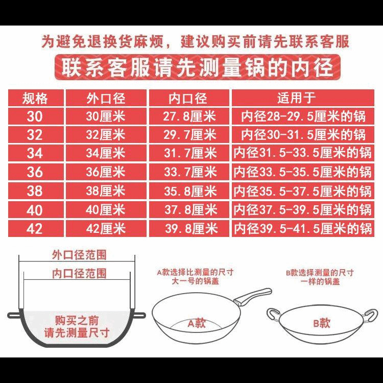 カラー 30蓋-内径27.8-29.2鍋に適しています,32蓋-内径30-31.3鍋に適しています,34蓋-内径31.8-33.3鍋に適しています,36蓋-内径34-35.3鍋に適しています,38蓋-内径36-37.1鍋に適しています,40蓋-内径38-39 .. 4鍋に適しています,42蓋-内径39.5-41.5鍋に適しています