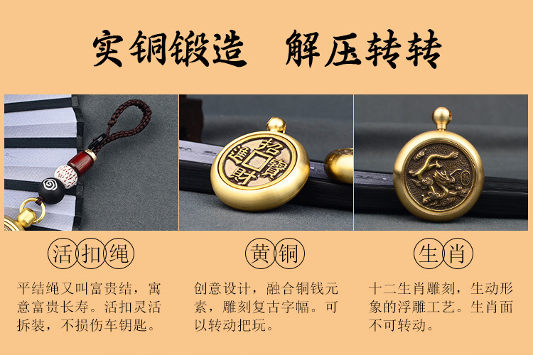 辰年干支回転キーホルダーペンダント、男女兼用、純真鍮製、五帝のお金、中空ひょうたん、卸売