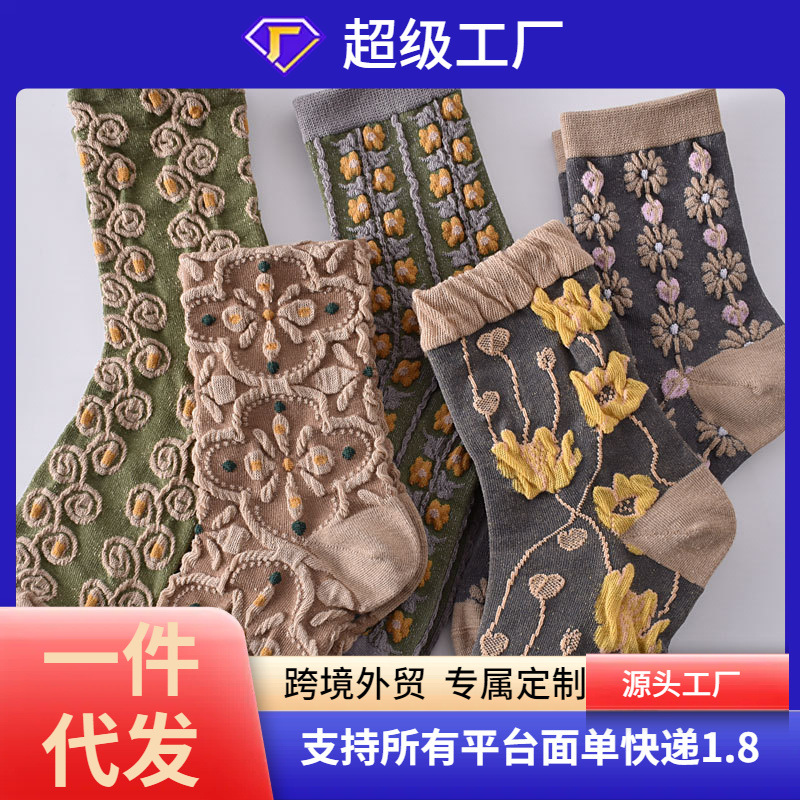 レトロな民族風の靴下の女性の中筒の靴下の秋冬の項の立体のレリーフのカレーの色の文芸の宮廷の風の砕花の女性の靴下