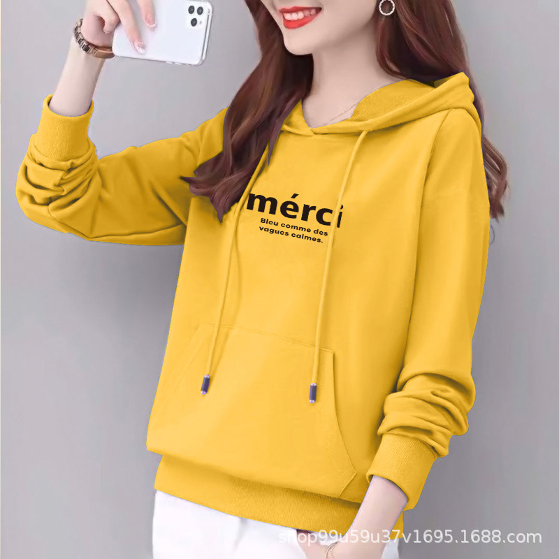 純綿の縁の帽子のパーカーの女性の春秋服のカジュアルなファッションのゆったりしている上着のアルファベットのプリントのスポーツウェアはやせているコートを見せます。