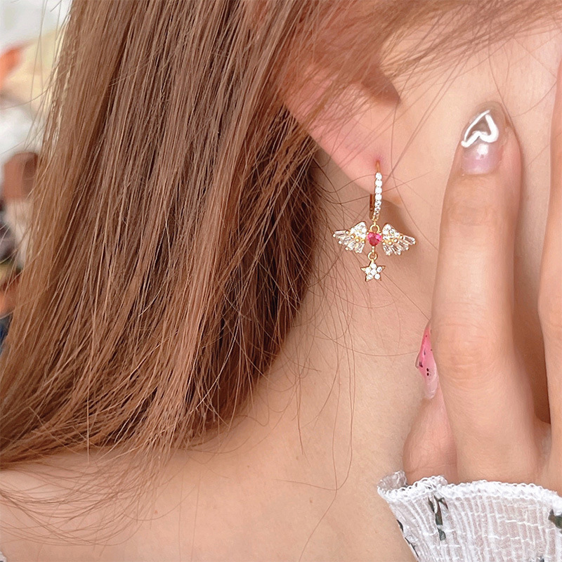 天使の耳飾り 赤いハート型イヤリング 女性らしい女神風 甘くてクールなデザインのイヤリング 七夕のギフトに彼女に贈る