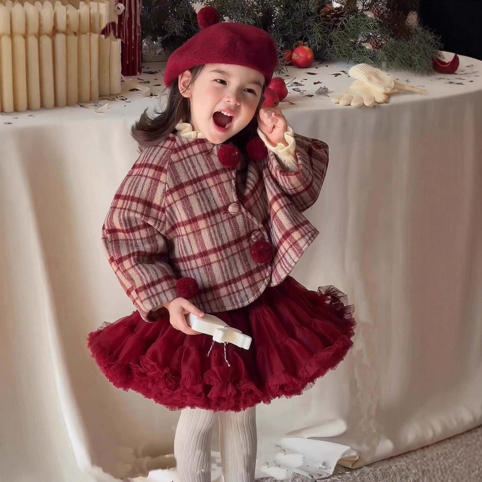 2025秋冬装新款女童套装圣诞服饰儿童复古洋气加绒格子外套tutu裙