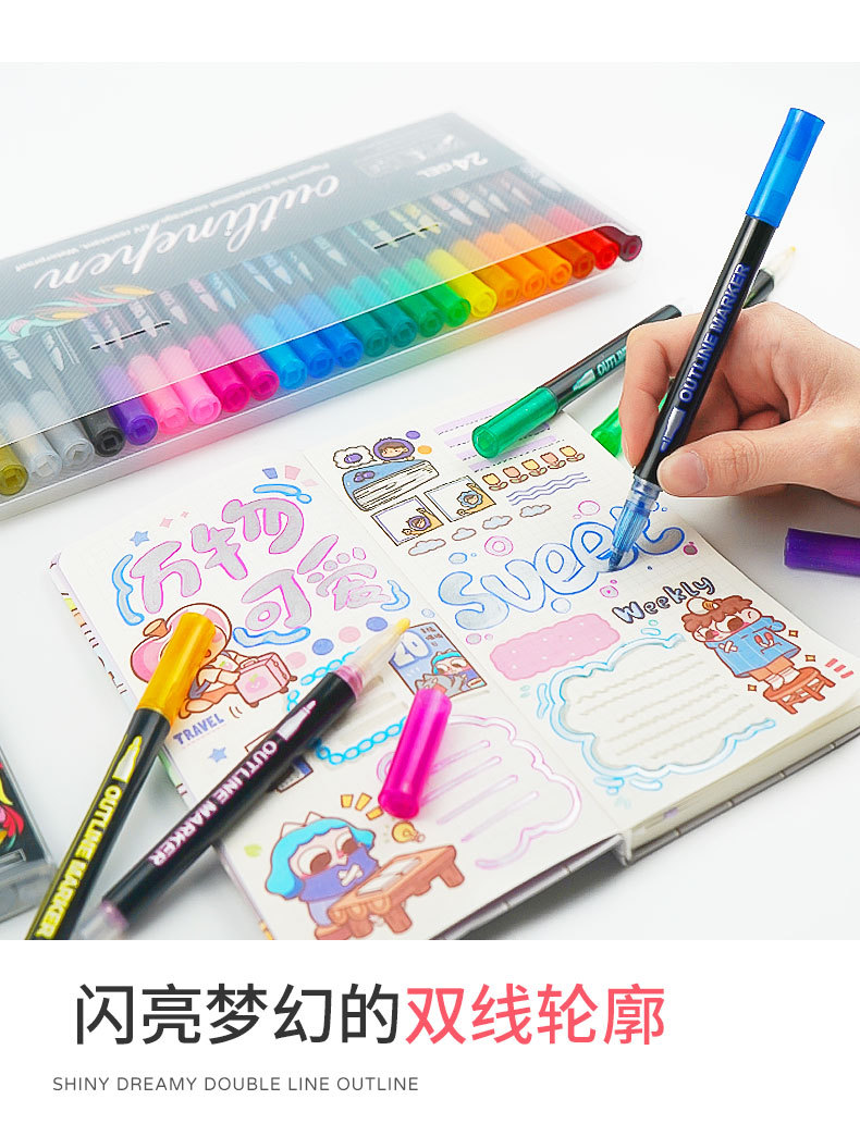二重線輪郭ペン24色セットdiy手帳蛍光ペンフラッシュペン金属カラー線マーカー落書き
