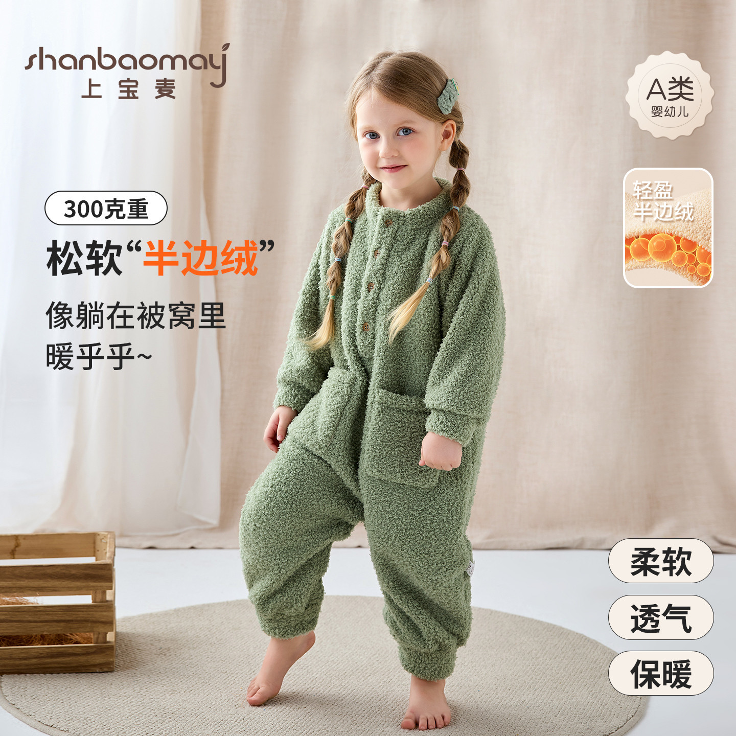 上宝麦半边绒儿童连体睡衣加绒加厚保暖睡衣男女童家居服连体衣