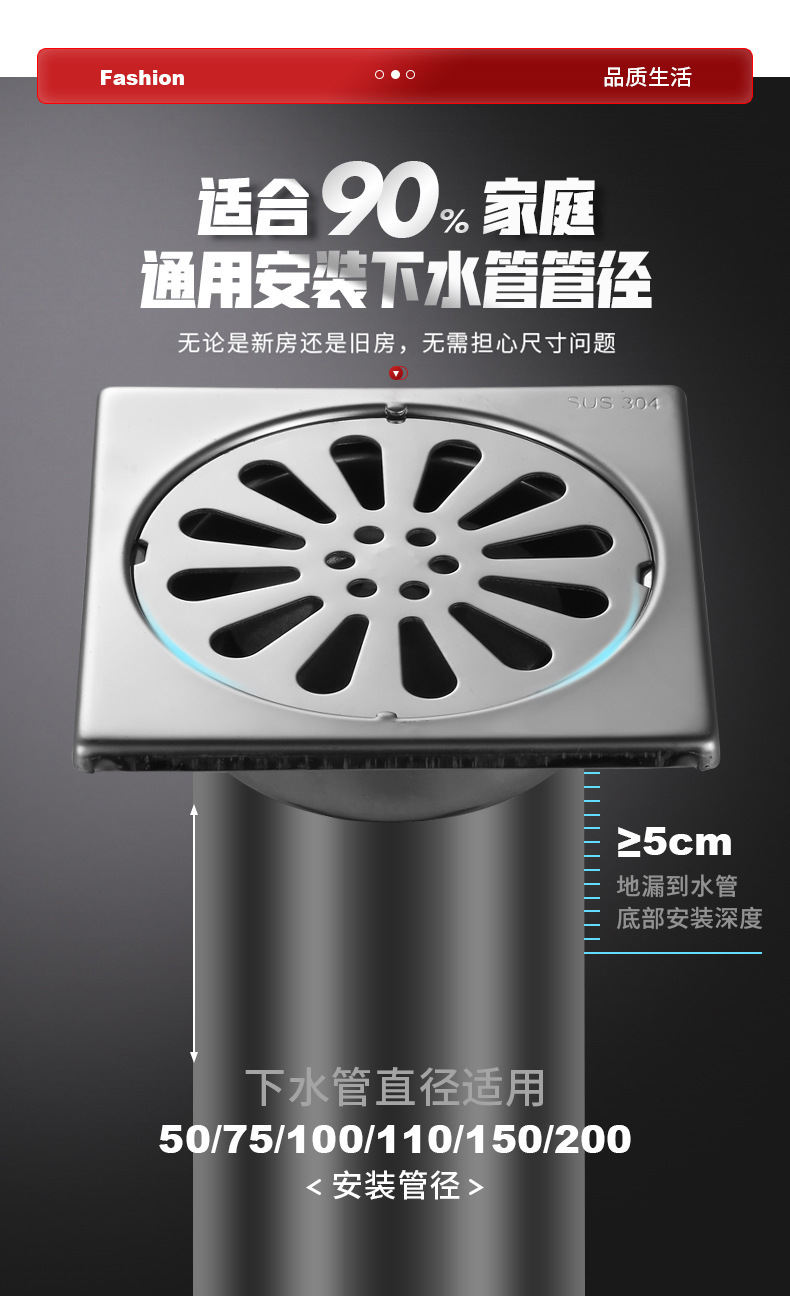 ステンレス製排水溝 DN50-75-110 浴室 バルコニー 洗濯機 家庭用 正方形 防臭排水溝 工業用