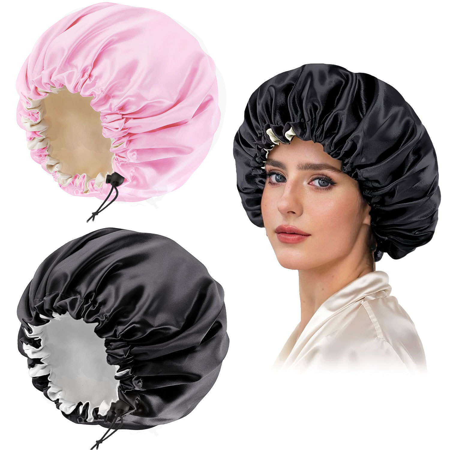 现货款式都带可调节扣,双层(材质一层色丁+PEVA防水层)OPP透明袋包装