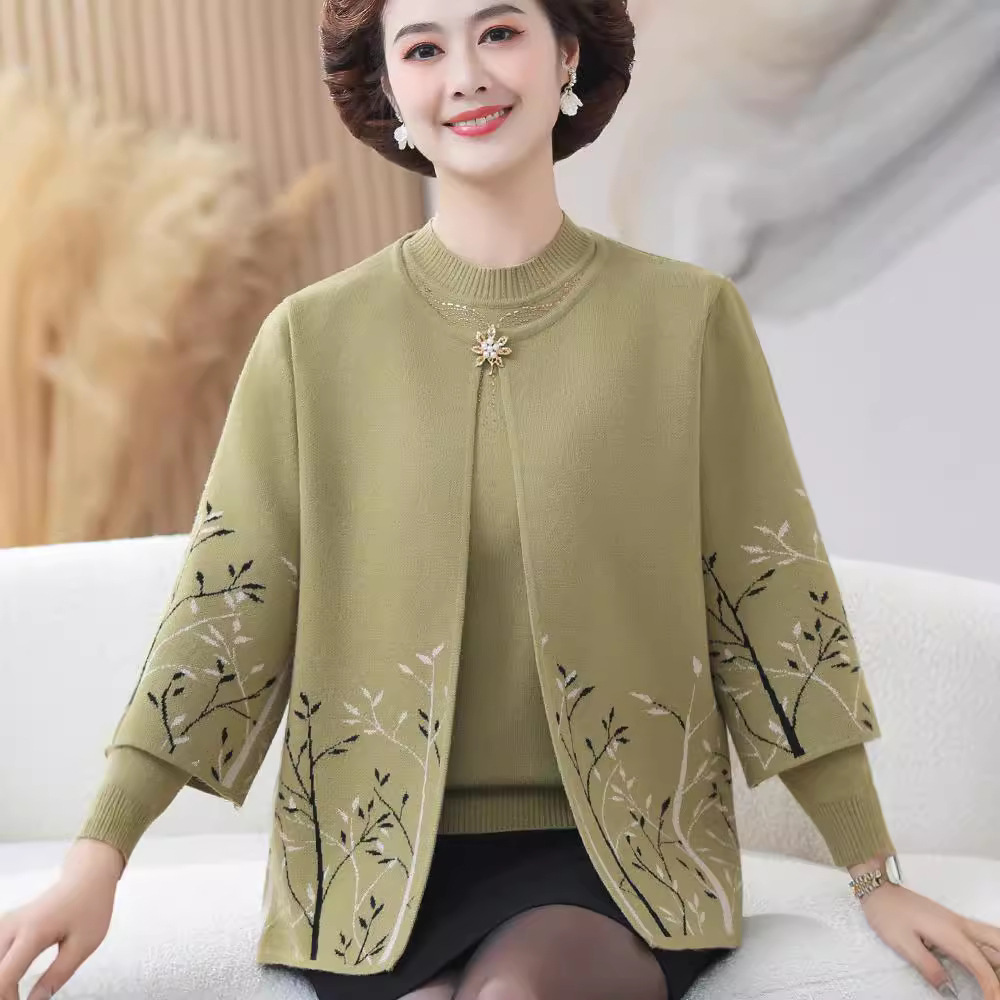 洋風のお母さんの秋の服のニットの2つのセットの2024年の中年の女性の上着の中で年配の女性の秋のカーディガンのコート