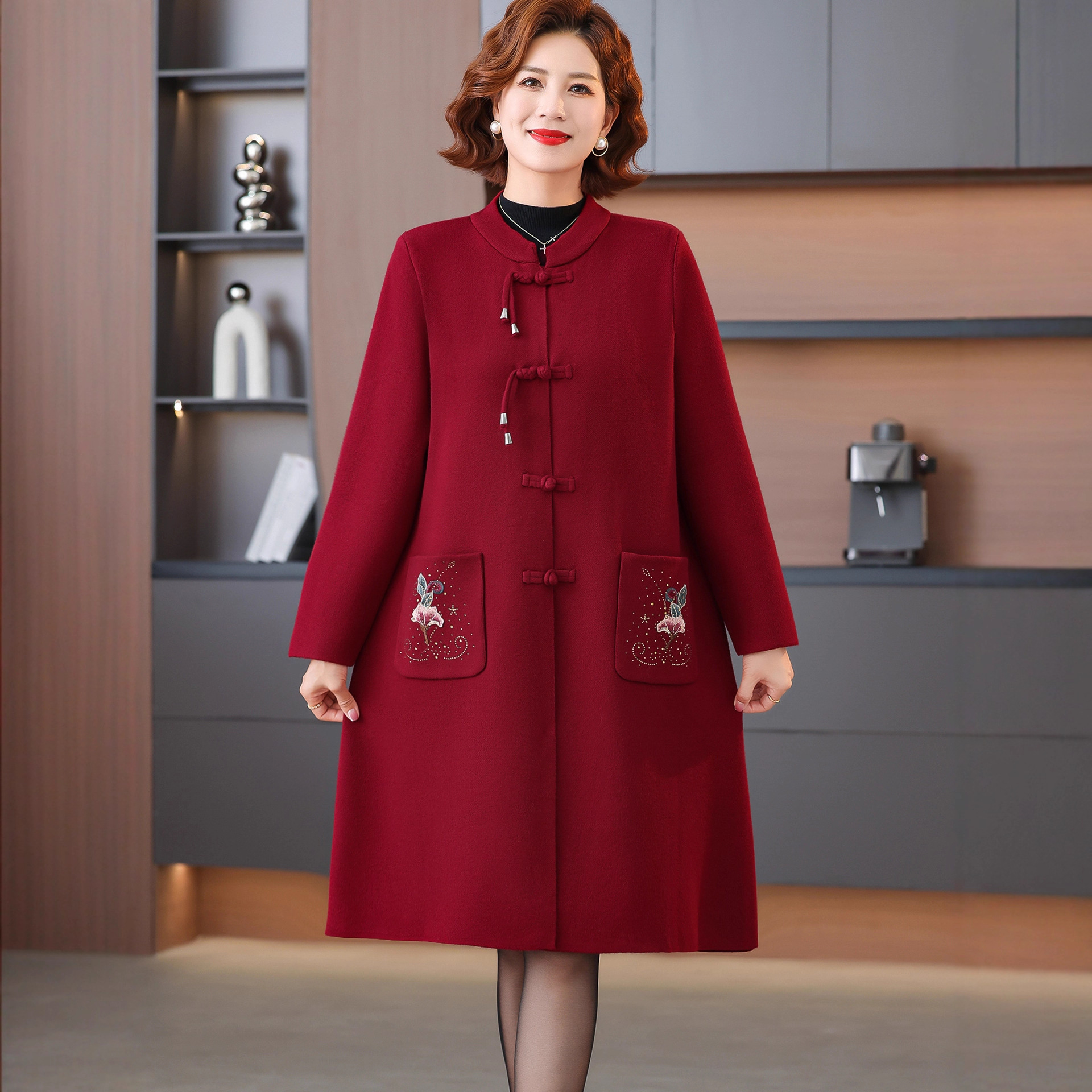 中老年人大码女装秋冬红色羊绒风衣外套喜婆婆妈妈毛呢大衣中长款