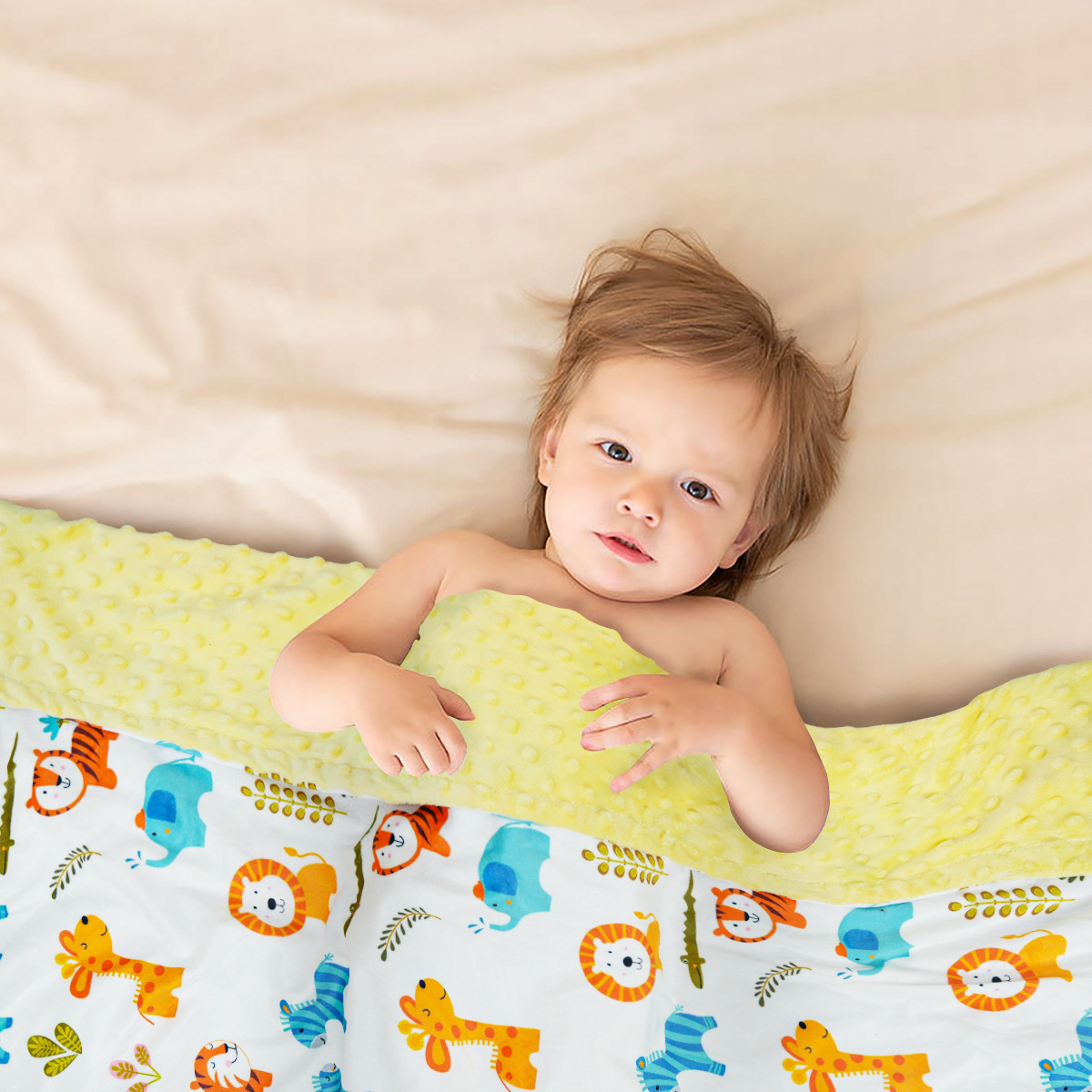 布料柔软,色泽饱满舒服又环保,不皱不扎手,使用更舒心的一条宝宝安抚毯子
