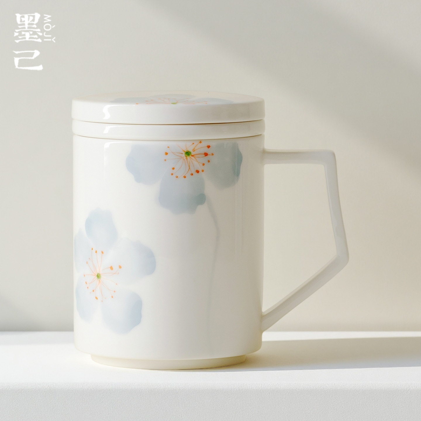 墨己白瓷手绘蓝影海棠办公杯家用带盖内胆茶水分离马克杯泡茶杯