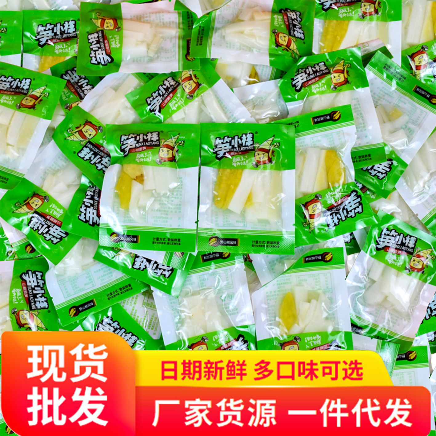 おやつの筍の小さい様子のピーマンのサクサクの筍の小さい包装のネットの赤いレジャーの間食は袋を開けて新鮮な山椒の竹の子の軽食を食べます。