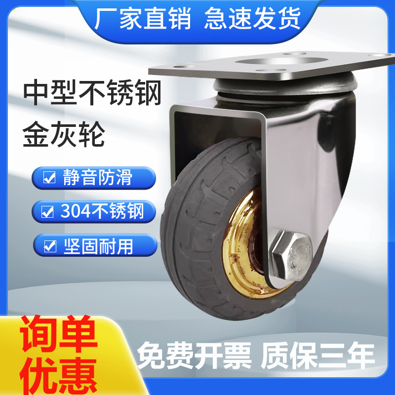 304ステンレス中型厚手弾力ゴム金灰輪キャスター万能輪手押し車耐摩耗荷重押しやすい