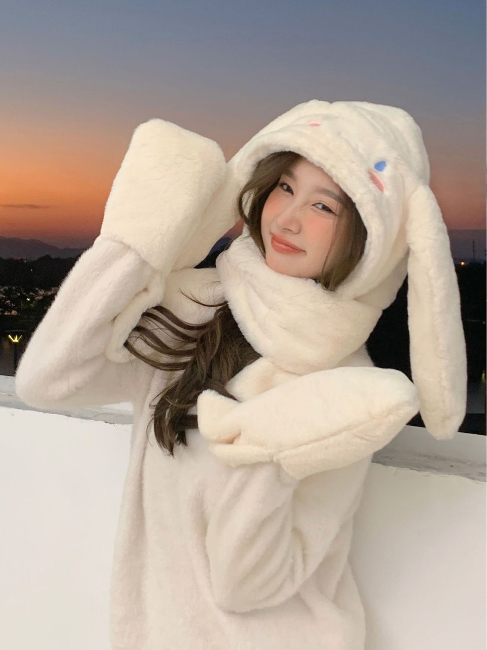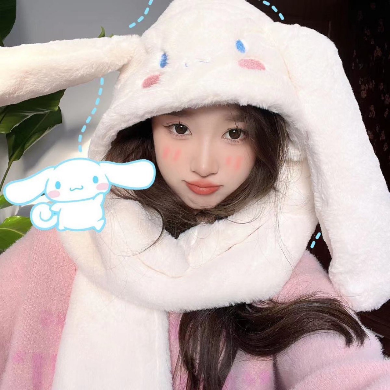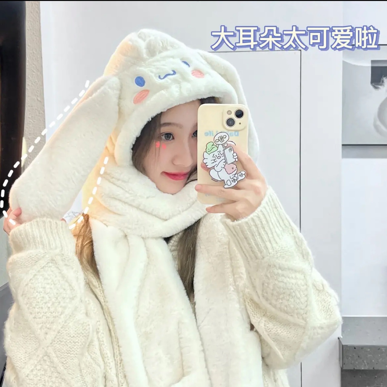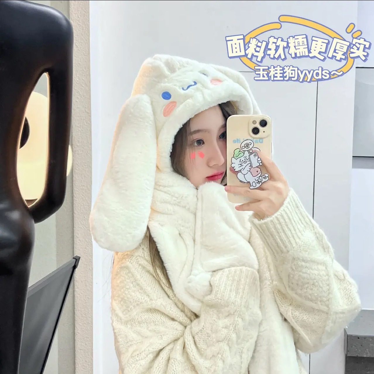 冬用帽子とネックウォーマー一体型、女性用のかわいいシナモロールスカーフと手袋の3点セット、暖かい、学生、女の子向け、ふわふわ。