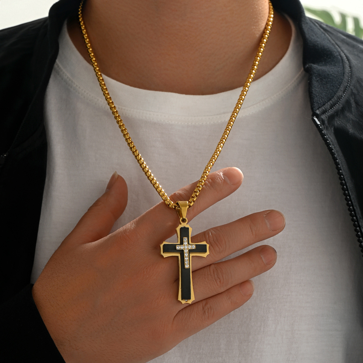 跨境外贸热卖不锈钢项链男士多层十字架带钻锆石吊坠项链欧美流行