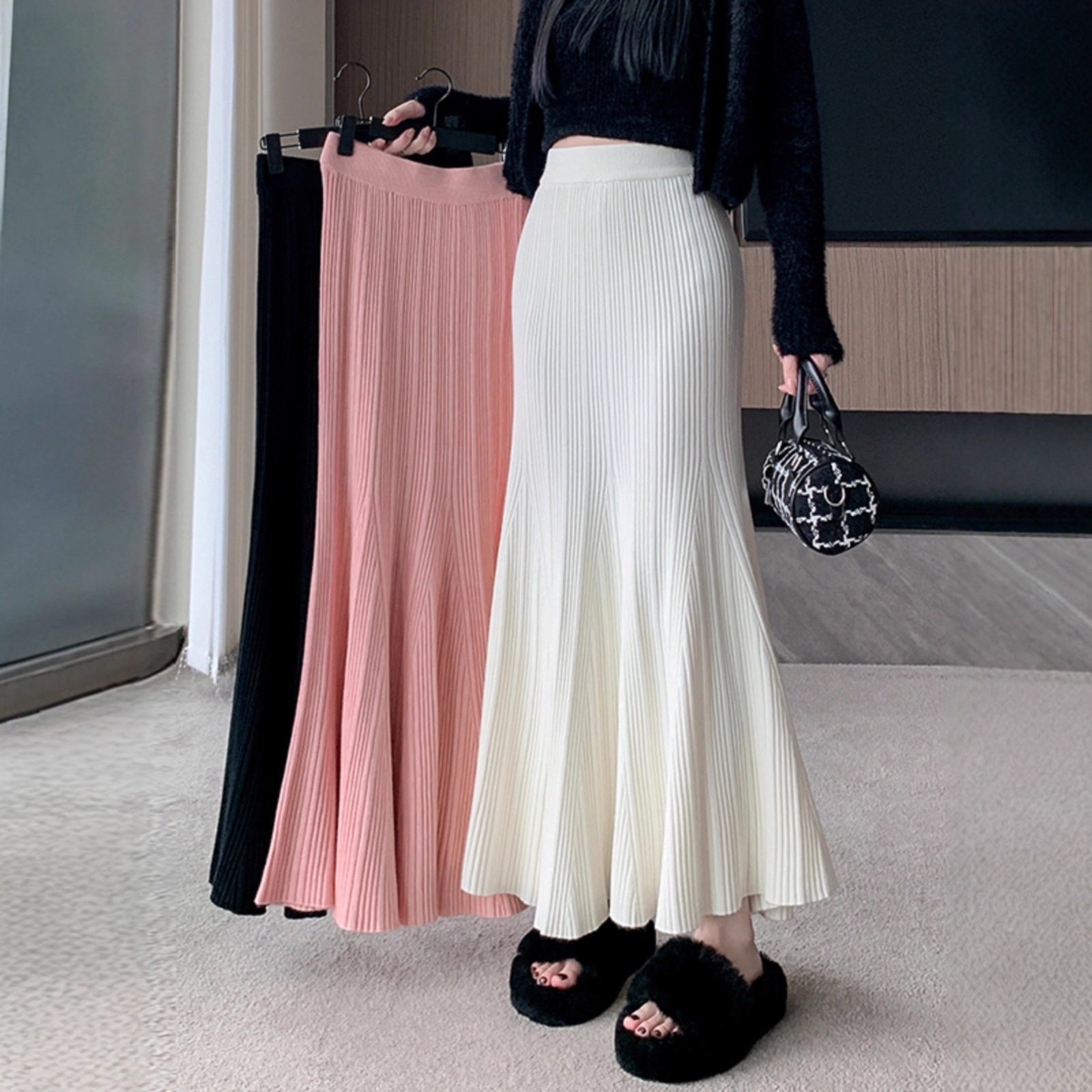 氛围感针织包臀鱼尾裙2025秋冬季新款高腰长裙垂感坑条A字大摆裙