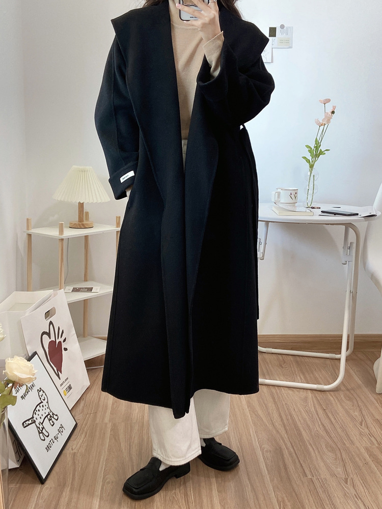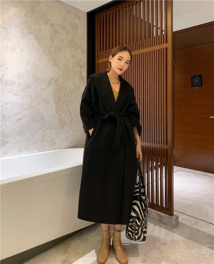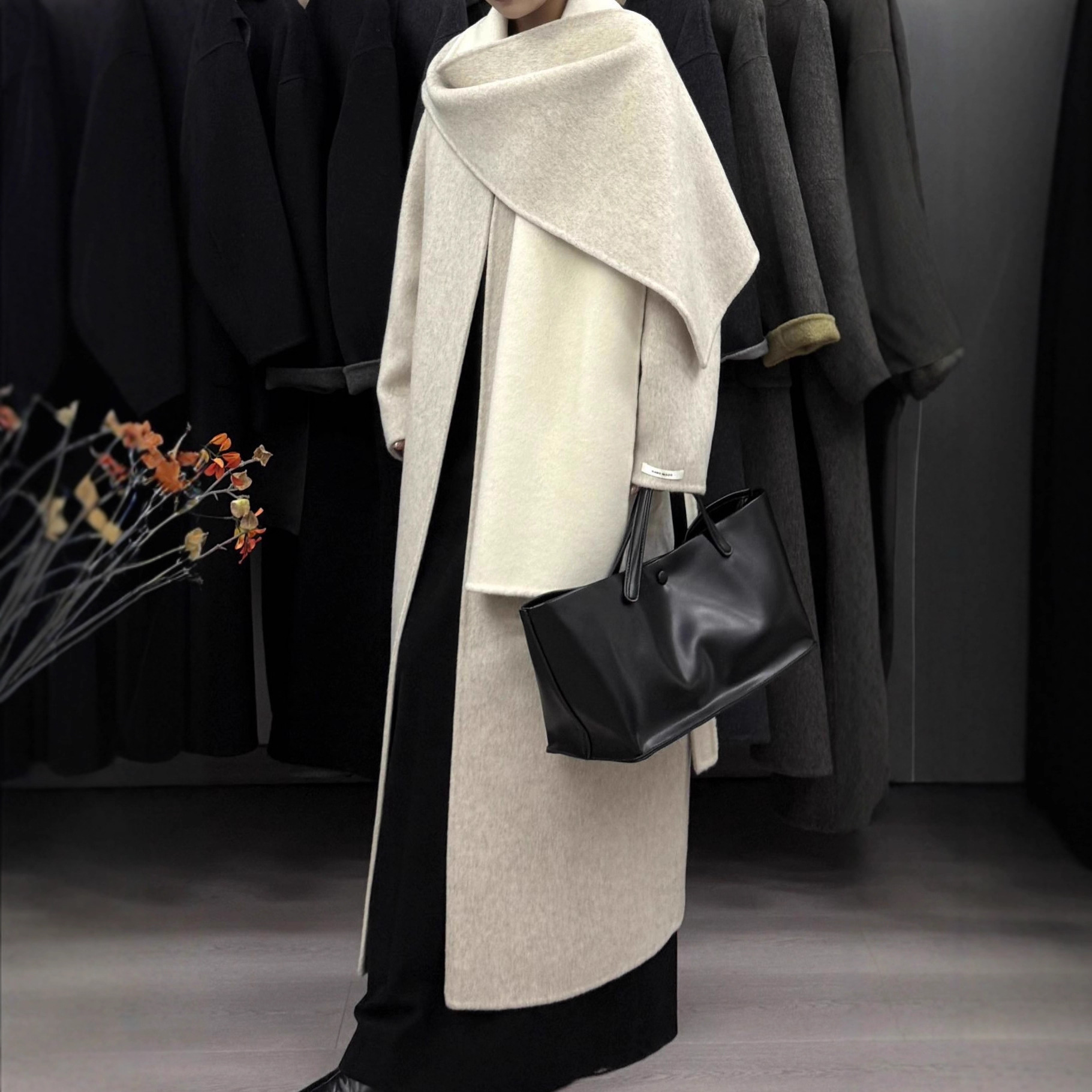 大围巾连衣简约名媛风双面羊毛大衣 长款宽松大口袋加厚毛呢外套