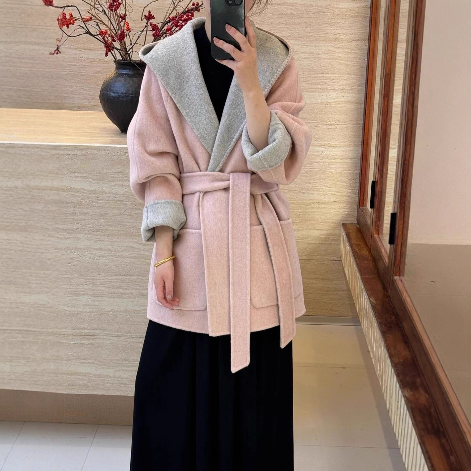 两面穿连帽系带双面羊毛 中长款大衣 花边加厚保暖羊绒气质外套