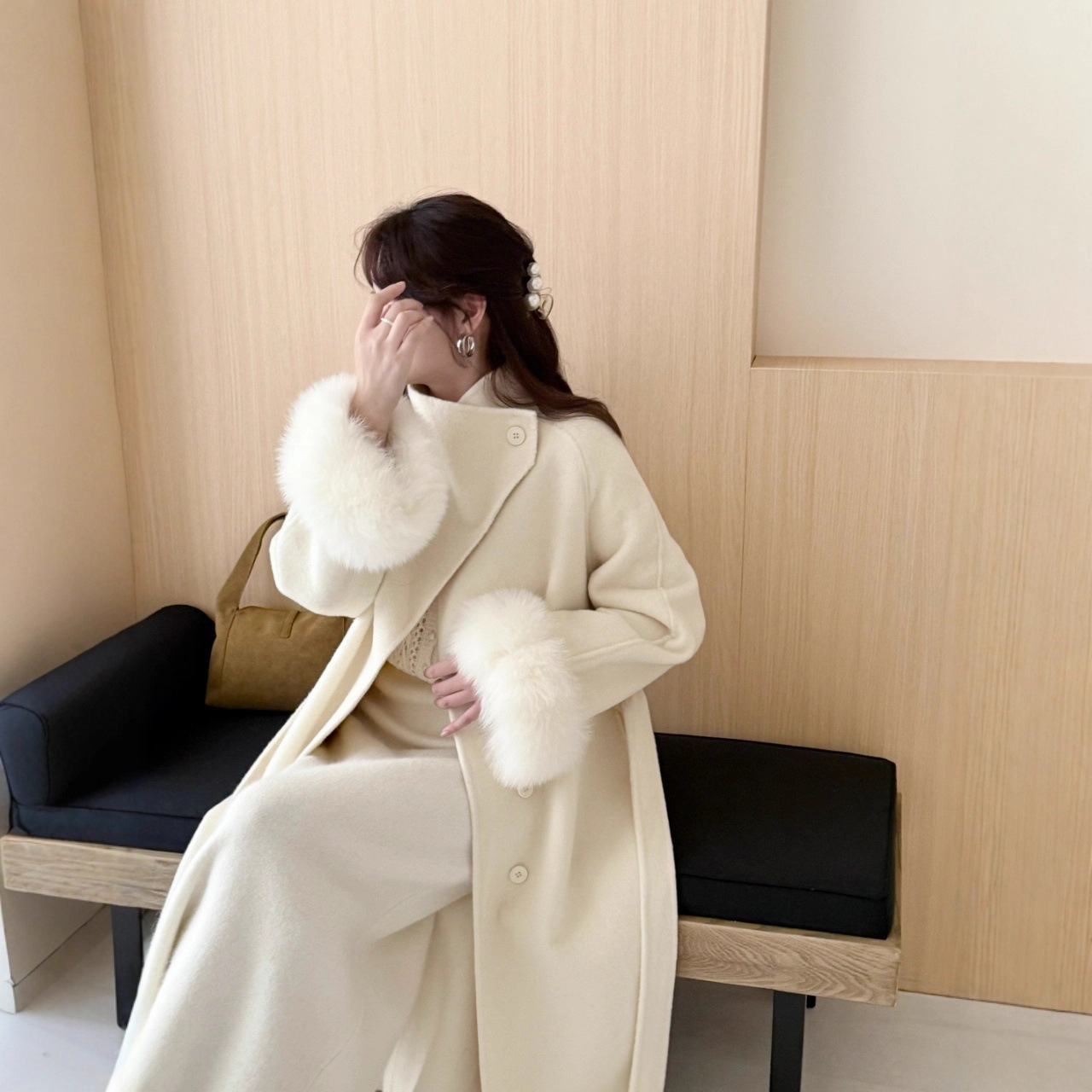 千金感真狐狸毛袖双面羊毛大衣长款腰带加厚保暖气质羊毛毛呢外套