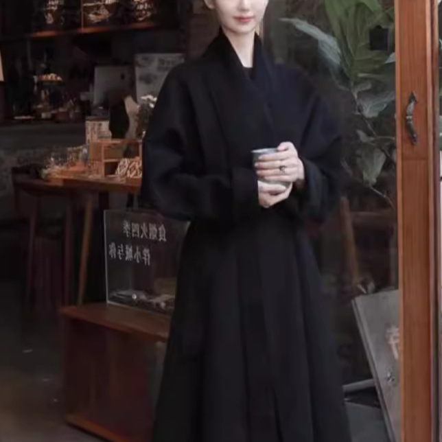 高級黒森系両面ウールコート秋冬ヘップバーン風厚手ロングウールロングコートレディース