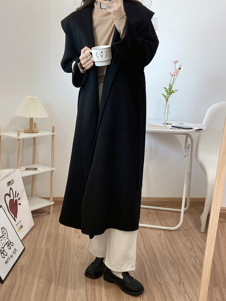 ヘボン風両面ウールコートのスタンドカラーの長いタイプの厚手のストラップ