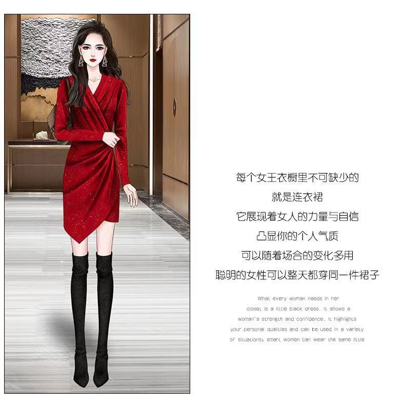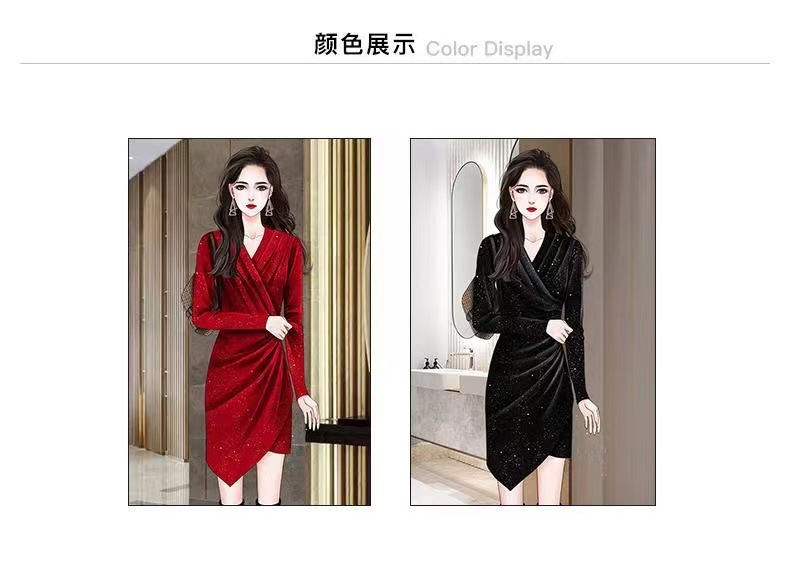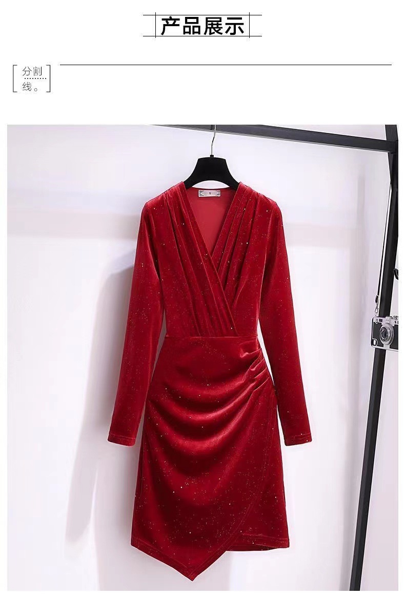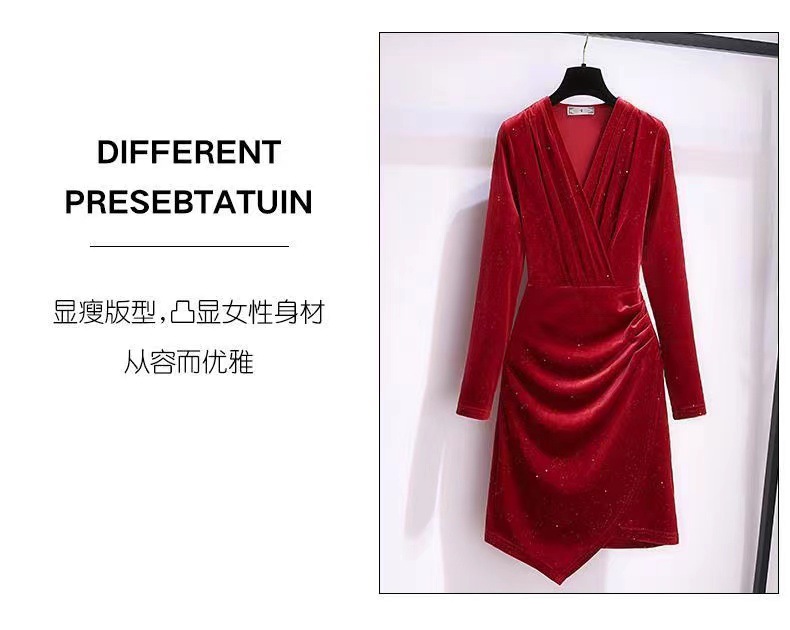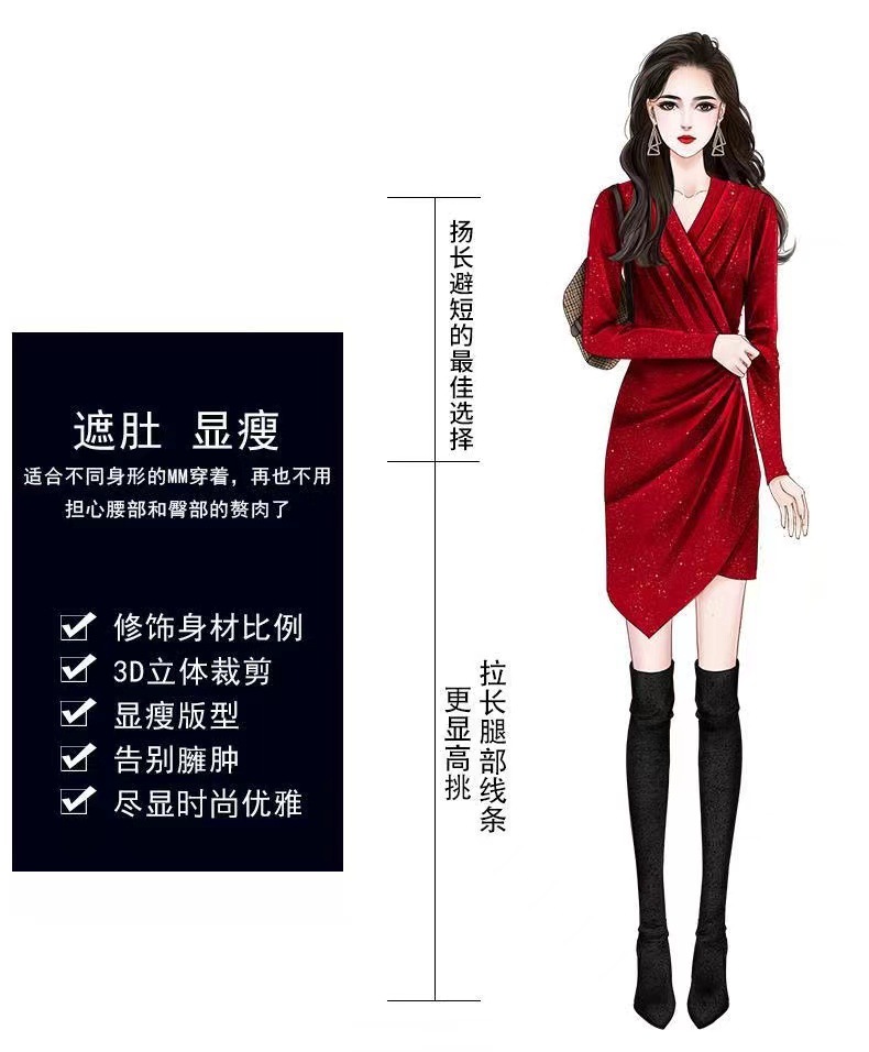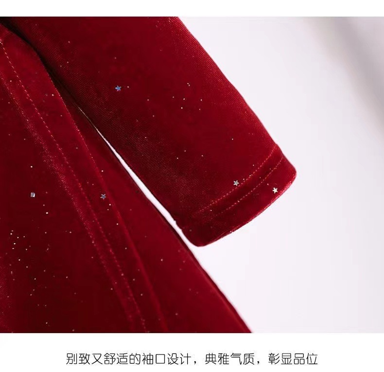 クリスマスの赤い年会の姉妹のベルベットのワンピース秋冬の新型の気質は気をつけてデザイン感のドレスの中でスカートの女性を設計します。