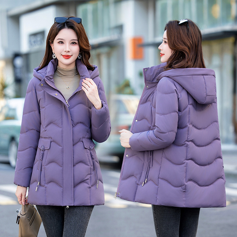 2025年冬新作の人気商品、韓国風スリムフィット中丈綿服、厚手で暖かい万能レディースコート